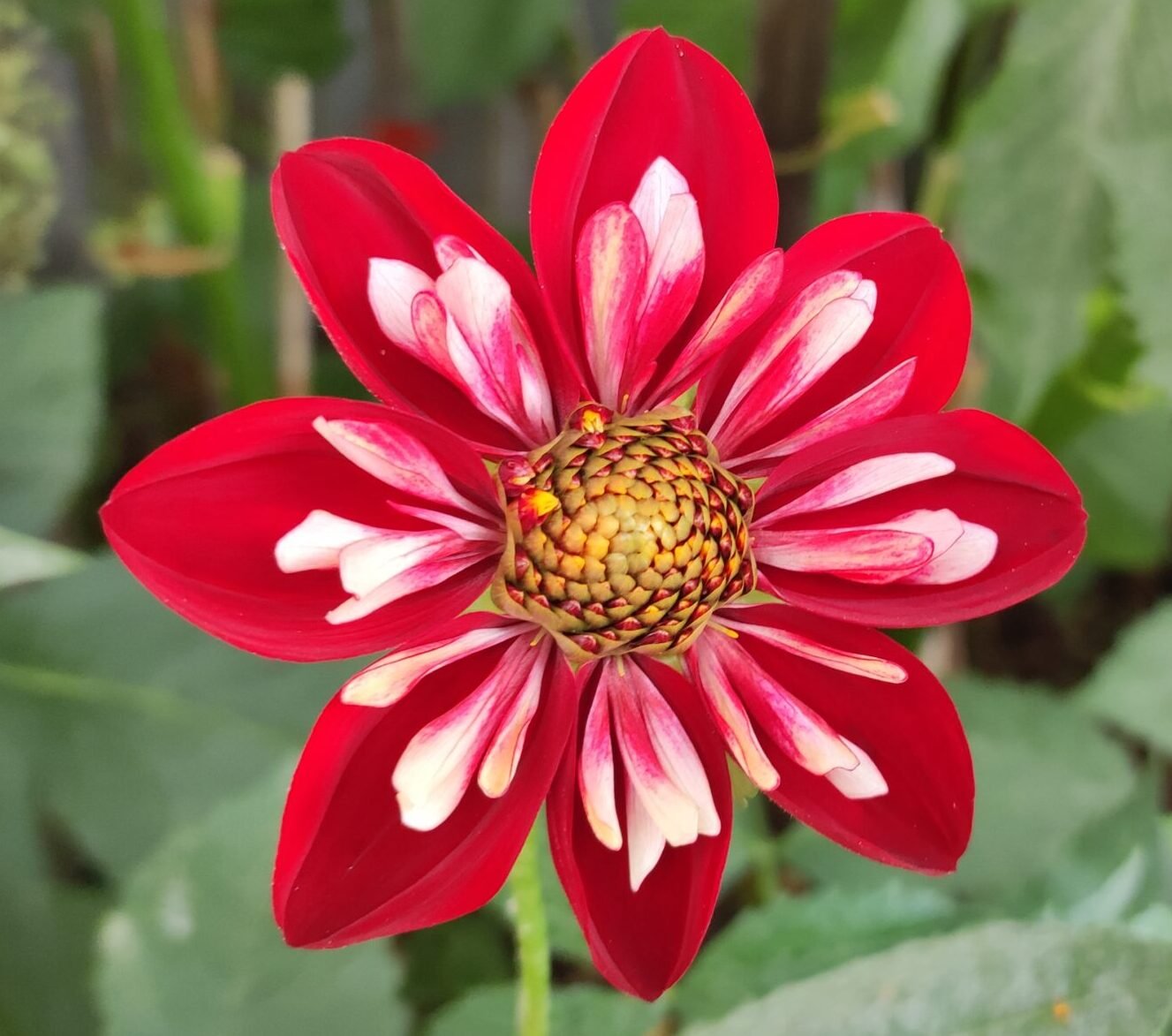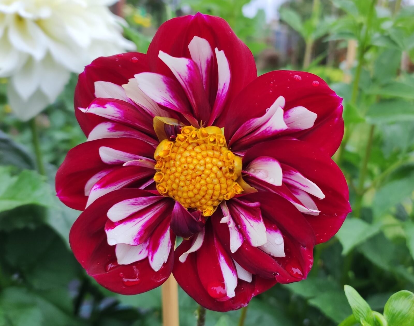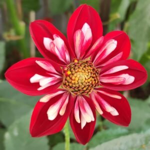 Joal Shelbie is a striking new Collerette dahlia introduced in 2023 by renowned breeders John & Jean Cuthbertson of New Zealand. Its vibrant blooms feature a dramatic combination of deep, rich red to maroon outer petals, contrasted by a charming inner collar of smaller petals in delicate shades of white and pale pink. At the flower’s center lies an intricate golden-yellow disc, further accentuating its unique beauty.