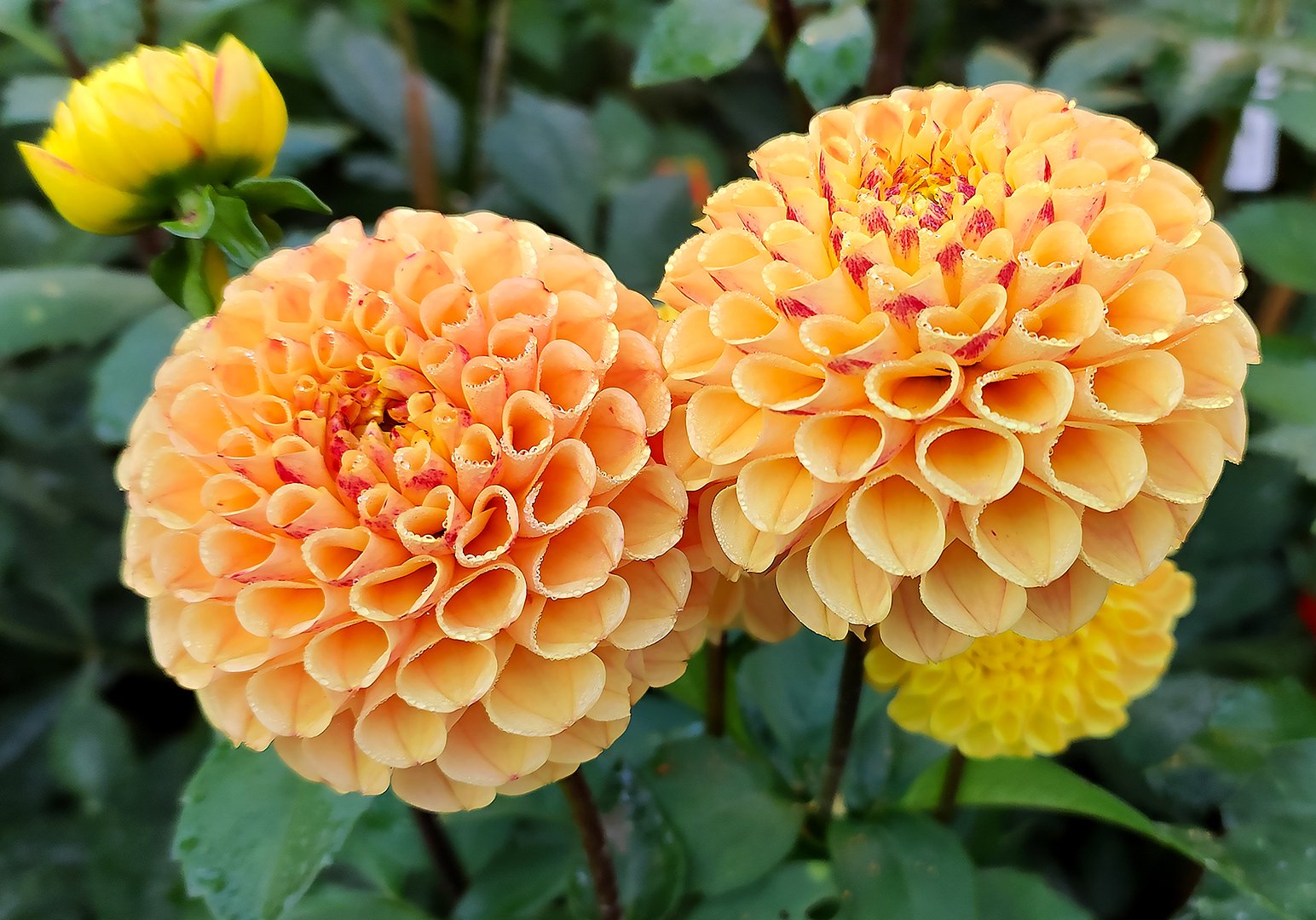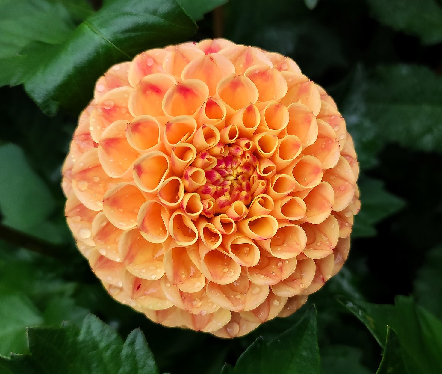 Jodie Wilkinson is a delightful ball dahlia featuring tightly packed, perfectly rounded blooms in a warm blend of apricot-orange suffused with soft yellow. At the heart of each flower, subtle red flecks and raspberry blushes add extra depth and charm.