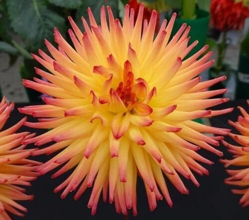 Josudi Aurora is a miniature cactus dahlia that dazzles with its stunning blend of orange, apricot, and yellow hues. This variety is a wonderful choice for garden beds or borders, adding a vibrant touch to any outdoor space. Additionally, it makes a great addition to cut flower arrangements or exhibition collections, offering both beauty and versatility.