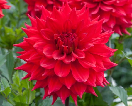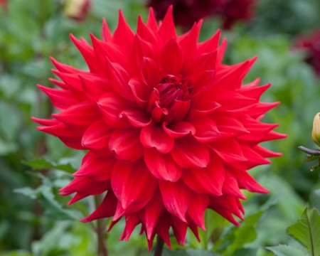 Dahlia ‘Kenora Wildfire’ is a dazzling dinner plate variety that brings a fiery burst of color to any garden. Its vibrant dark red blooms are exceptionally large, often rivaling the size of a child’s smiling face, and they never fade, maintaining their intense color throughout the season. These striking flowers, with their bold presence, can create a stunning display in garden beds or floral arrangements. While the stems are strong, the immense size and weight of the blooms make staking necessary to ensure they stand tall and proud. ‘Kenora Wildfire’ is a true showstopper, perfect for gardeners looking to add dramatic flair to their outdoor space.
