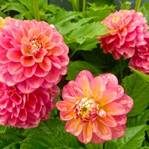 Dahlia ‘Milena Fleur’ (also known as Dahlia ‘Milena F’) offers a captivating blend of coral pink and apricot tones, highlighted by its gleaming golden centers, infusing a soft, tropical vibe into any garden. This variety is a member of the waterlily class of dahlias, characterized by its double blooms with a distinctive, flattened sphere shape. Each large flower, measuring about 10 cm across, makes a striking impression both in the garden and as a cut flower, with a vase life of 5-7 days.