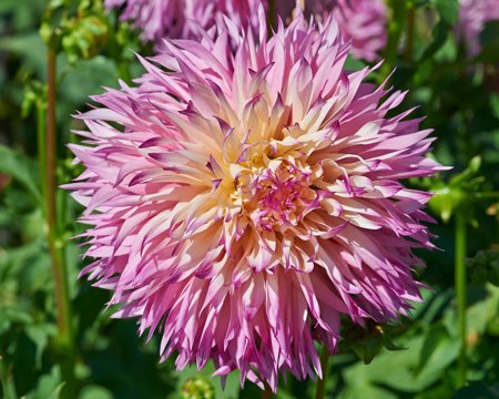 Pinelands Princess Dahlia is a striking and delightful variety, known for its strong growth and distinct, eye-catching appearance. Its creamy petals, dipped in fuchsia, have a unique, fringed look, reminiscent of being clipped with pinking shears. The large, fluffy 7″ blooms are a beautiful blend of pink lavender that fades to white at the center, creating a very full and lacy appearance. Growing on a somewhat compact 3 1/2′ plant, this floriferous dahlia is not only a stunning addition to any garden but also a reliable bloomer, producing sturdy flowers with orange and yellow accents. The Pinelands Princess can be regularly cut or pruned, making it ideal for filling your home with cut flowers or even using as thoughtful gifts.