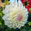 Ryecroft Brenda T is a beautifully refined small formal decorative dahlia. Its dome-shaped blooms are a creamy white with a soft blush of lavender or pink nestled at the center, giving it a romantic, ethereal quality.