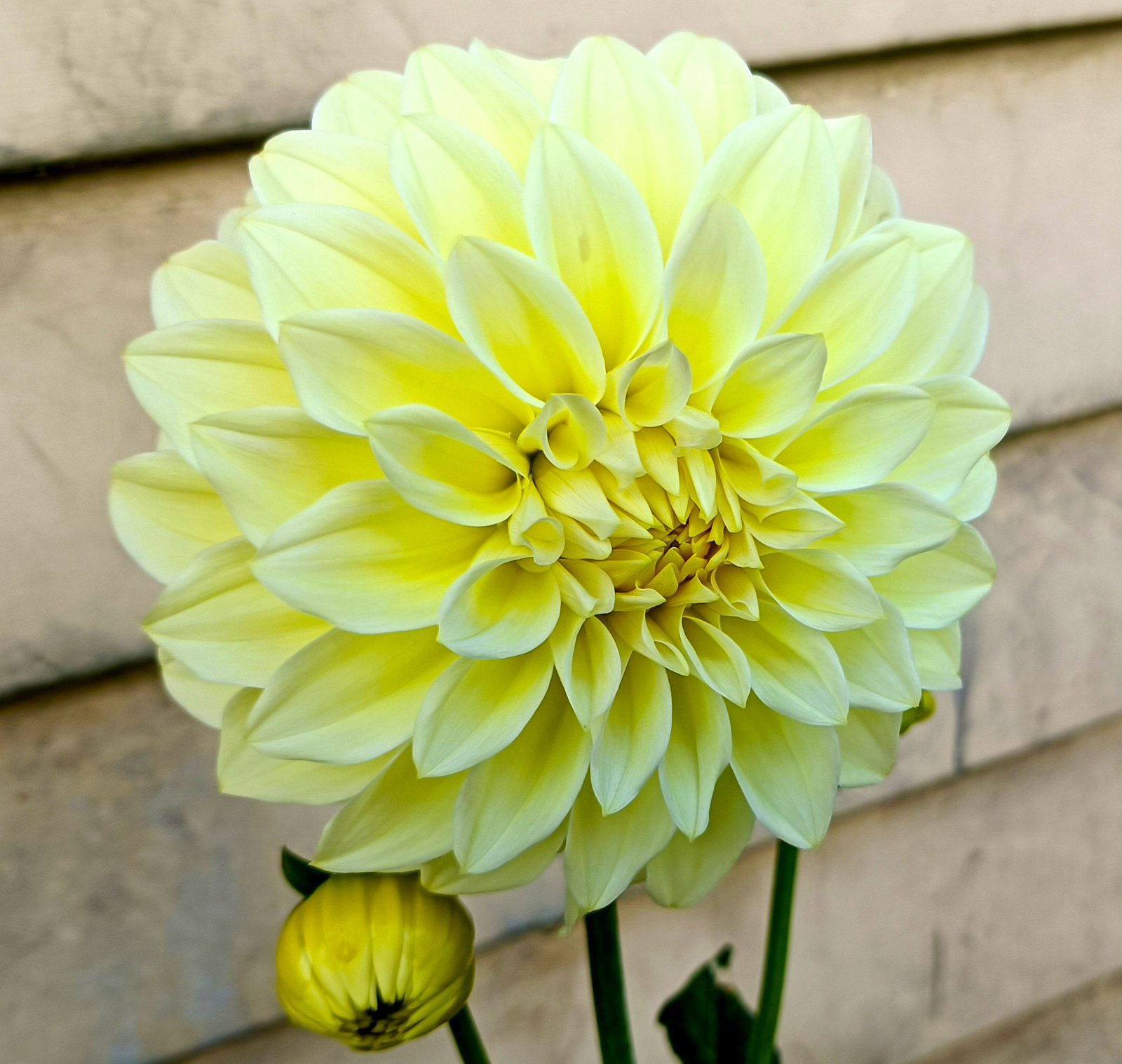 Dahlia ‘Trengrove Millennium’ is a soft lemon-colored medium decorative dahlia that grows up to 1.2 meters tall. It features green leaves and large double flowerheads, reaching up to 20cm in diameter. The pale yellow florets subtly shade to a brighter yellow at their bases, creating a gentle gradient effect. Blooming from summer to autumn, ‘Trengrove Millennium’ adds a touch of elegance and brightness to any garden with its delicate yet striking color palette.
