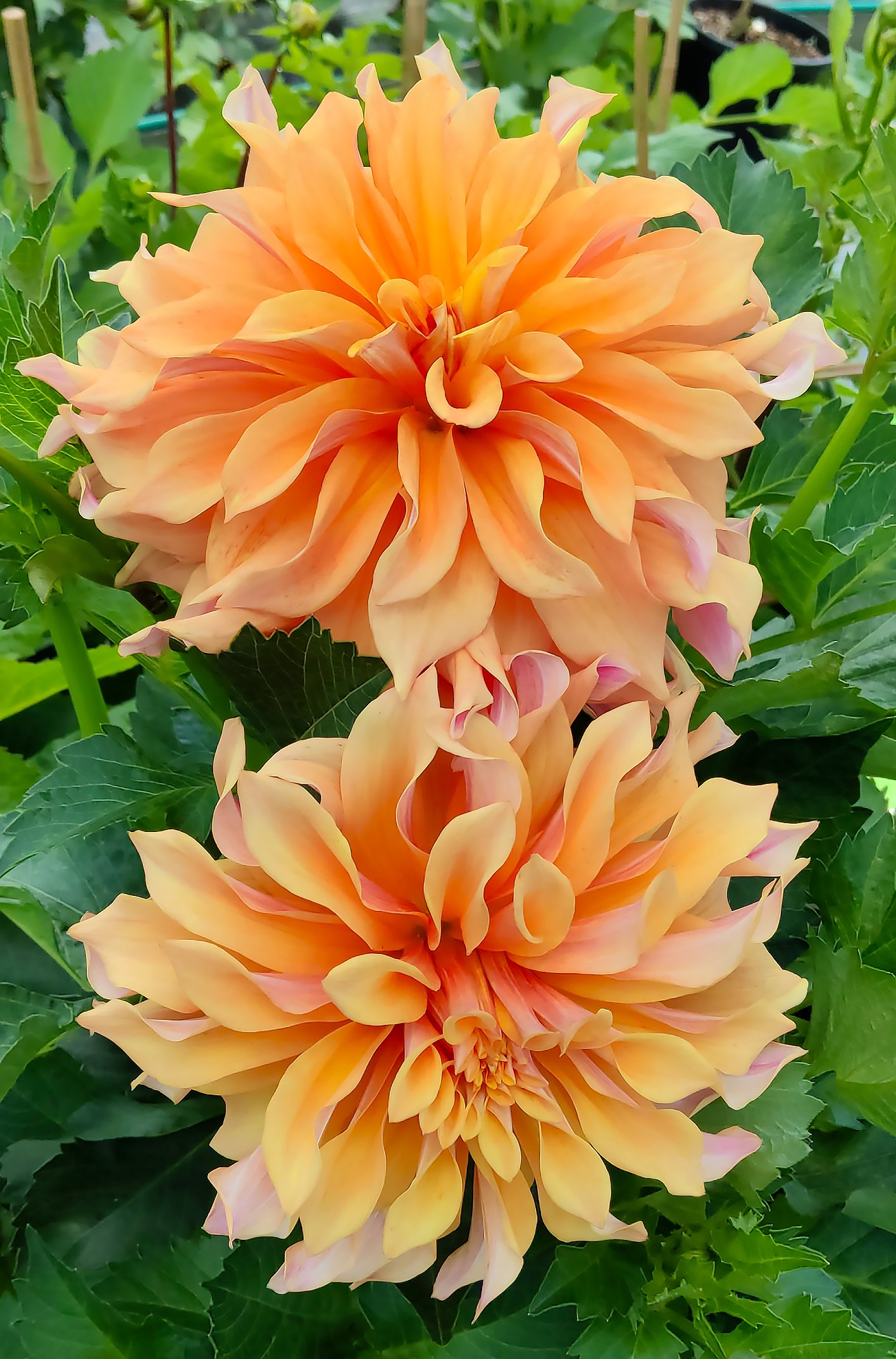 Dahlia ‘Tyrell’ is a stunning decorative variety that captivates with its fully double, 6-8 inch blooms in a rare apricot hue. When sunlight hits a generous planting of ‘Tyrell’ dahlias, they emit an ethereal rose gold glow, making them a true head-turner in any garden. The layers of peach and apricot petals, accented by buttery yellow centers, give this beauty a rich texture and sparkle. With its gracefully twisting petals, ‘Tyrell’ blooms early in the season and continues to impress as it matures. The color transitions throughout the season, starting with a warm apricot and mustard combination with a corally pink wash, giving it a melon-colored feel. As the weather cools, the pink fades, leaving behind a beautiful yellow that provides a different, yet equally lovely, appearance. Tall plants with long stems make ‘Tyrell’ a perfect choice for adding vibrant color and texture to both gardens and floral arrangements.